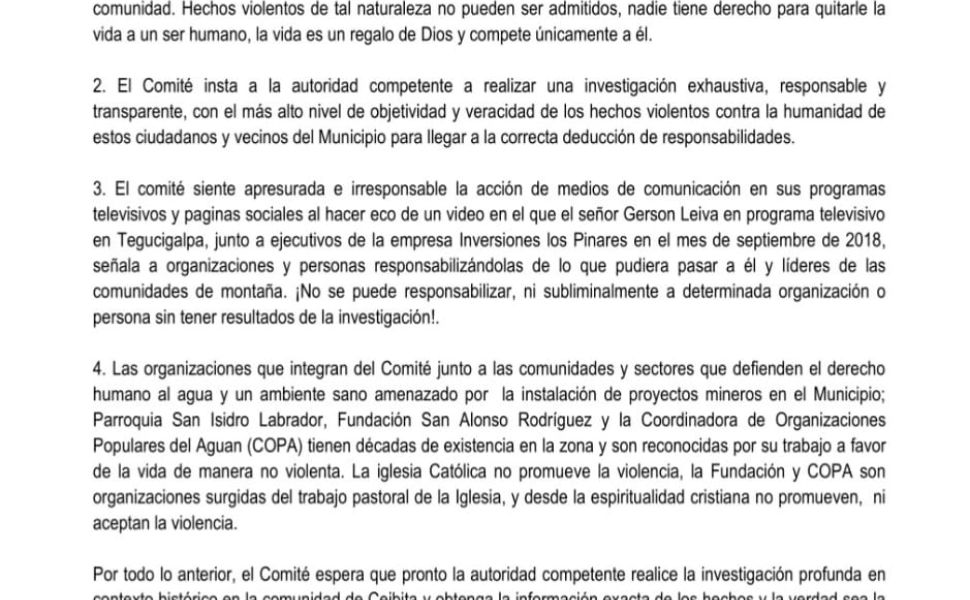 1. Condenamos todo hecho violento que atente contra la vida y los derechos humanos, y Comunitarios; por lo que se debe investigar el origen de dicha muerte para evitar especulación y campañas de odio y terror en la comunidad donde se pueda aprovechar la Empresa minera Inversiones los Pinares, que quieren destruir la zona núcleo del Parque Nacional Montaña de Botaderos Carlos Escaleras Mejía.